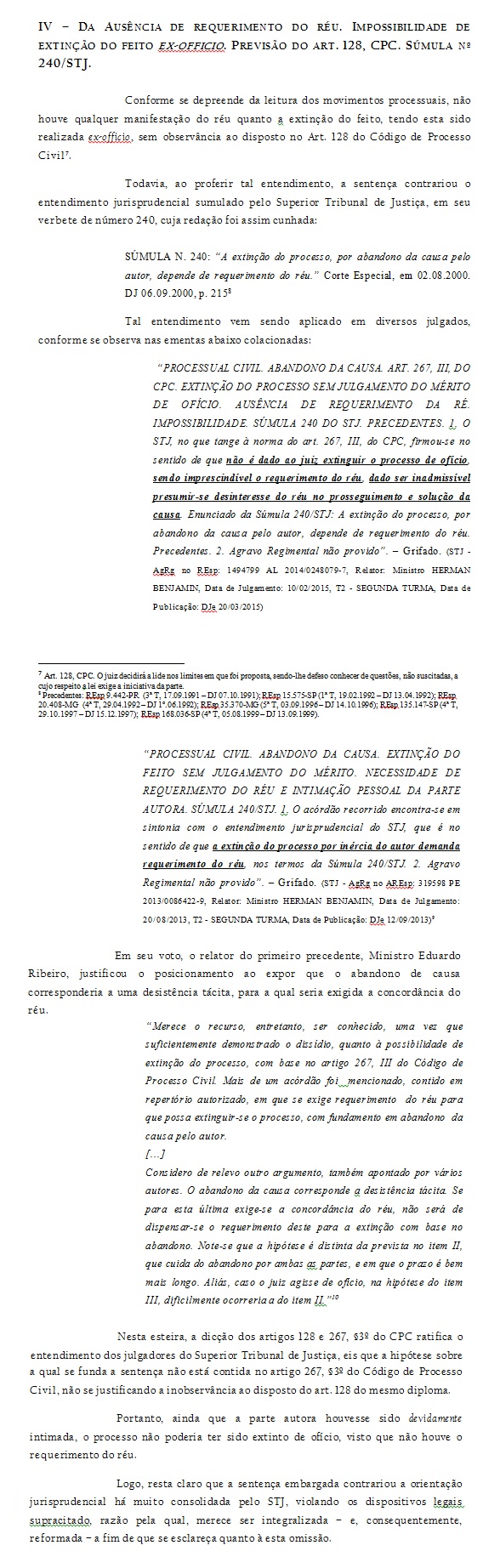 Ausência de requerimento do réu. O STJ sumulou entendimento de que o processo só pode ser extinto por abandono de causa se a extinção for requerida pelo réu. Eu penso que isto coaduna com o disposto nos artigos 267, §3º e 128 do CPC. Primeiro, porque o legislador menciona expressamente as hipóteses em que o juiz poderá extinguir o feito de ofício no §3º. Tudo bem, o rol pode até não ser taxativo, mas ele não foi posto ali à toa. Ademais, penso que esta iniciativa seria uma forma do juiz agir como parte, o que é expressamente vedado pelo artigo 128 do CPC. Como bem disse o STJ não seria razoável presumir que o réu não tenha interesse na resolução do conflito.