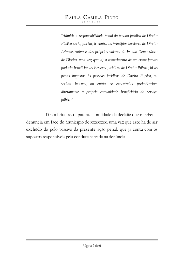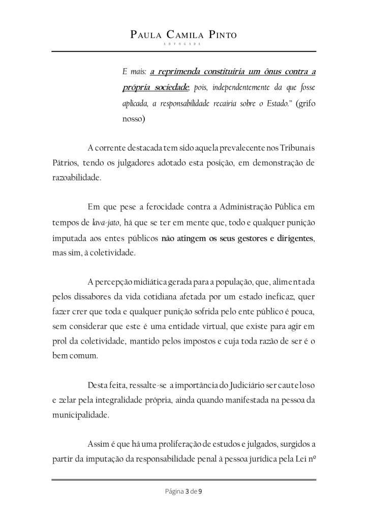 (grifo nosso)Ante tudo isso, filio-me às teses acima transcritas para deferir a exclusão do réu MUNICÍPIO DE XXXXXXXXX do presente feito, sobretudo porque a coletividade não pode ser penalizada pela prática criminosa de agentes públicos que atuaram nas gestões anteriores, pelo que reputo ineficaz qualquer aplicação de pena à pessoa jurídica de direito público.