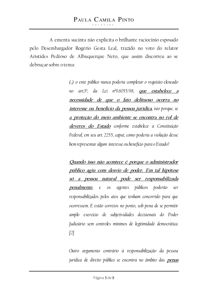 responsabilização criminal, devendo-se alcançar apenas os seus agentes, mesmo porque é impossível juridicamente a aplicação de determinadas sanções, a exemplo da liquidação forçada. Ademais, inexiste funcionalidade na aplicação de pena às pessoas jurídicas públicas, pois por via transversa toda a coletividade estará sendo sancionada, sendo mais efetivo responsabilizar os agentes públicos ímprobos”. (Direito Ambiental, 5ª ed., Salvador: Juspodivm, 2017, p. 335)Neste sentido, cito o seguinte julgado:
