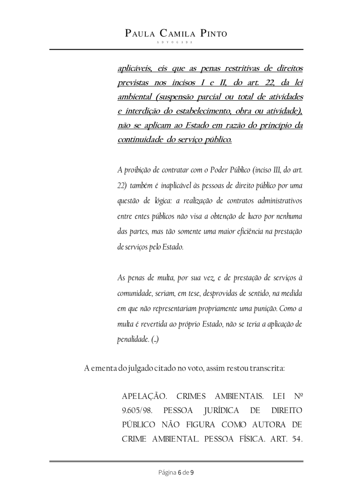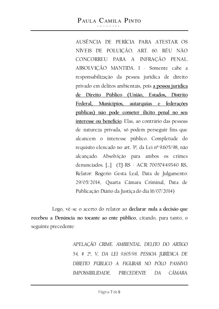 Apesar da pouca jurisprudência acerca do tema, temos que o TJRS já encampou esse entendimento: “Somente cabe a responsabilização da pessoa jurídica de direito privado em delitos ambientais, pois a pessoa jurídica de Direito Público não pode cometer ilícito penal no seu interesse ou benefício. Elas, ao contrário das pessoas de natureza privada, só podem perseguir fins que alcancem o interesse público. ( TJRS, 4 C. CRIM., APELAÇÃO CRIME Nº 70057449340, REL. ROGERIO GESTA LEAL, J. EM 29/05/2014).