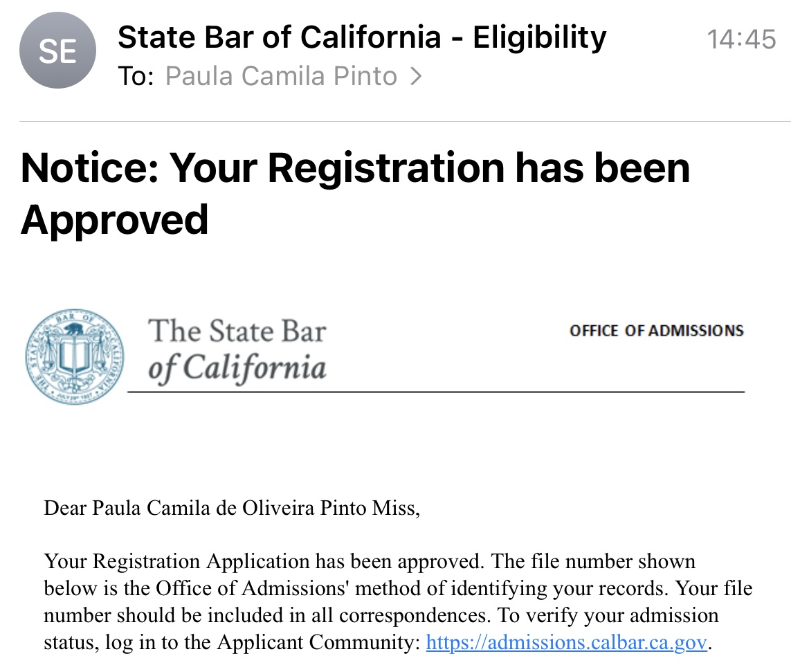 Em Janeiro de 2021 me registrei na State Bar of California – Ordem dos Advogados da Califória. É o primeiro passo de ALGUNS… mas só essa pequena vitória já me deixou super feliz!