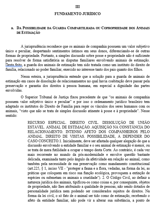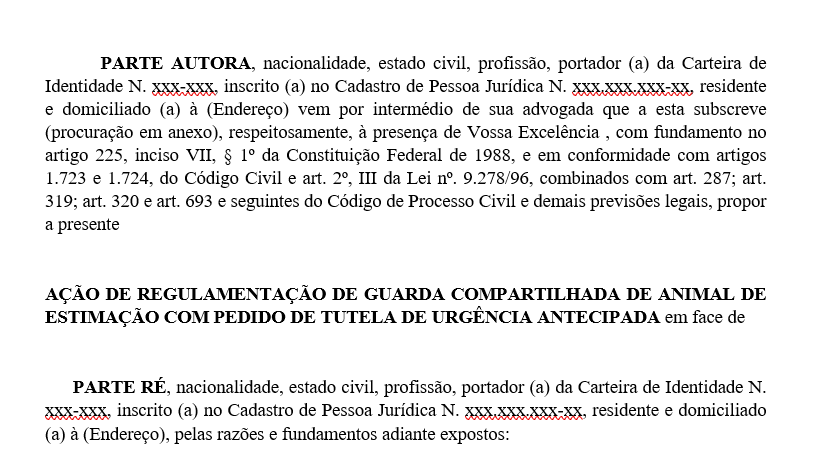 Assim, tem sido cada vez mais comum a resolução de conflitos envolvendo animais nos Tribunais. A seguir, trago uma petição inicial simples e curta para regularização de guarda compartilhada de um animal de estimação: