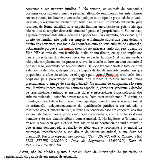Quando é cabível? Atualmente, a ação de guarda compartilhada de animais de estimação é fruto de uma construção jurisprudencial, eis que não há legislação regulamentando-a. Um marco jurisprudencial neste caso foi o julgado do Superior Tribunal de Justiça em 19 de Junho de 2018 nos autos do Recurso Especial Recurso Especial Nº 1.713.167 – SP (2017/0239804-9).